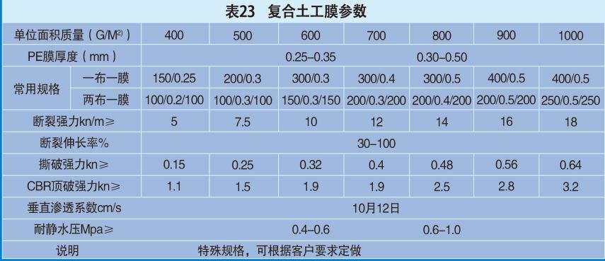 復合土工膜分為一-布一膜和兩布一寬幅4 6m重量為200 1500/m2,復臺土工膜能滿足水利、市政建筑,交通地鐵、隧道等工程建設中的防章隔離補強,防梨加固等土木工程需要。由于其選用離分子材料目生產(chǎn)工藝中添加了防老化劑,固可在非常規(guī)溫度環(huán)境中使用,常用于堤壩,排水溝渠的防滲處理以及發(fā)料廠的防污處理。